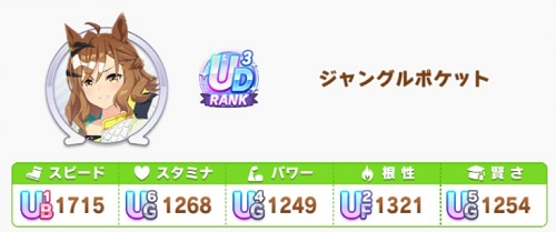 舞台設定および、中盤・終盤・高いステが揃ってるジャングルポケットに勝利するには、こちらも高水準なステが求められます。全体的に凹みが無いようにする必要があります。その中でもスピードとスタミナをしっかり上げることが重要です。この2つのステータスをどのように上げるかでサポカや因子の編成が変わってきます。