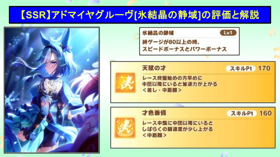 「天賦の才」は終盤加速スキルとなっており、「才色兼備」は後方脚質の中距離の中盤長時間速度スキルとなっている。