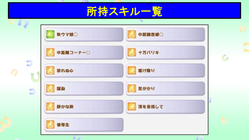 後方脚質と中距離、そして差しの3種類のスキルを複数持ち合わせており白スキル数も平均的で実用的なスキル群と言える。