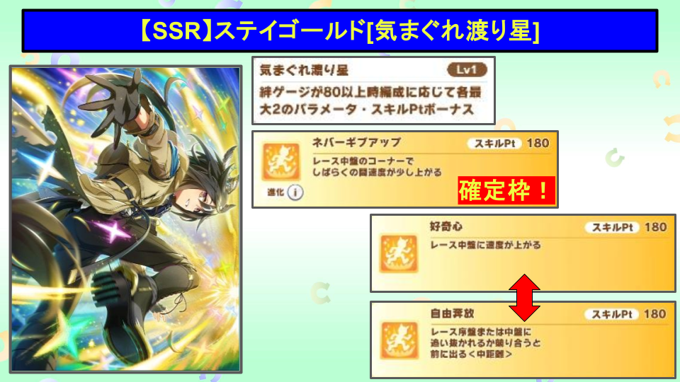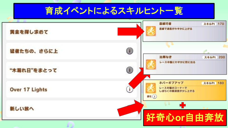 金スキルはイベント3段階の最後でヒントを得る事ができ、[ネバーギブアップ]が確定で[好奇心or自由奔放]のどちらかを選べる。