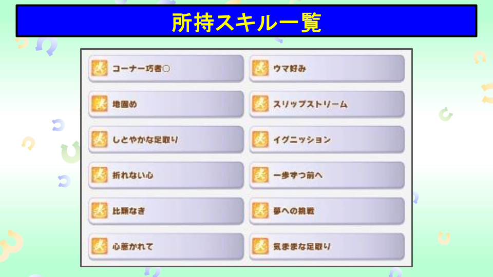 後方脚質と中距離のスキルを複数持ち合わせており白スキル数も平均的で実用的なスキル群と言える。