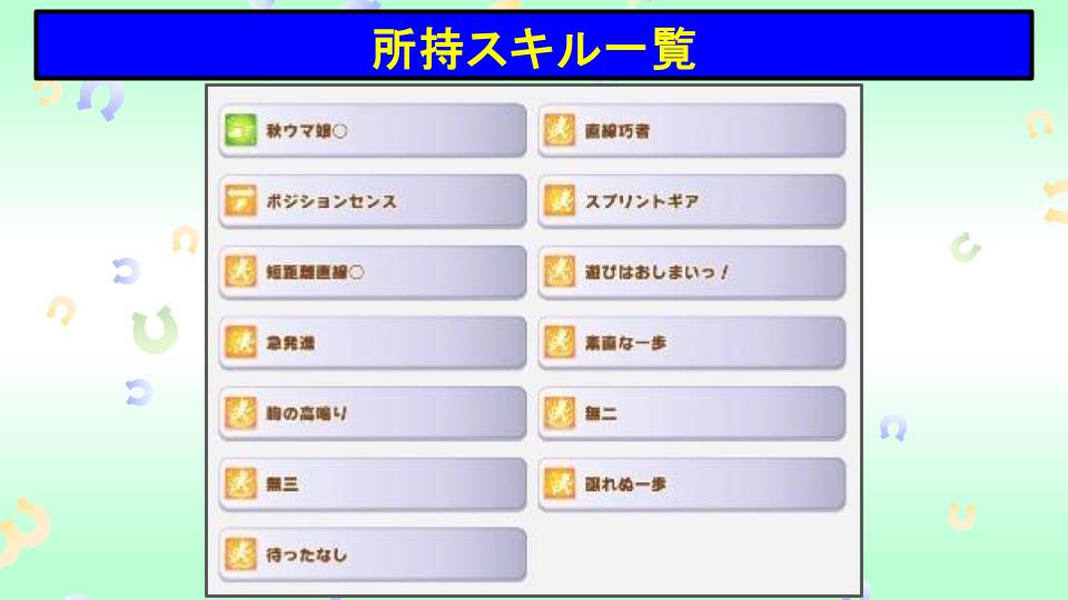 短距離・マイルに注力された性能で追込のスキルも複数所持しており金スキル2つ確定で選択できるのは魅力的な内容だ。