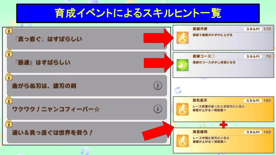 イベント内容は総数は5つとSSRサポカでは平均的ではあるものの最短距離1000m(直線)にバフが貰える「直線コース〇」と実用性の高い「直線巧者」のヒントを取得できるのも良い。