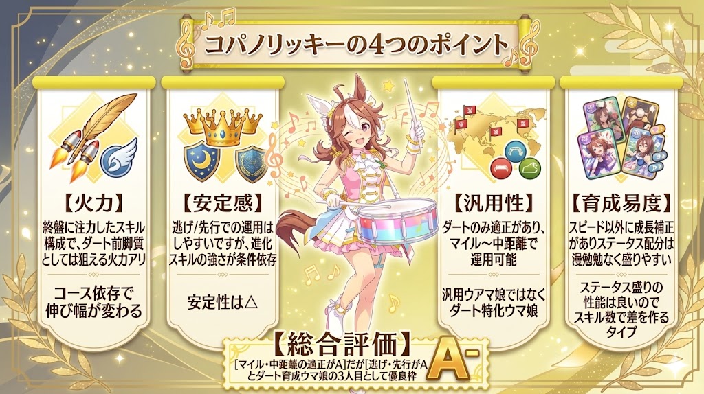 - 逃げ/先行適性が高く、ダート前脚質向けのスキル構成が噛み合う